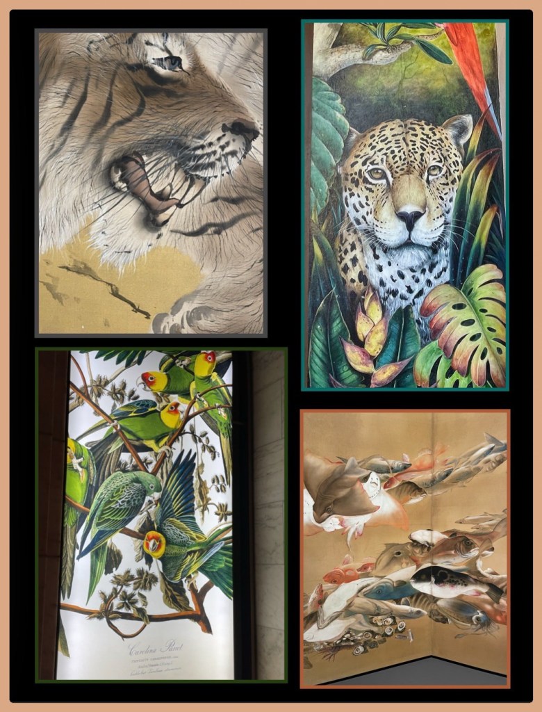 Top left Japanese painting of a tiger photographed in the Asia Society Museum in New York; top right Leopard wall mural photographed in Costa Rica; bottom left Audubon painting of parrots photographed in the NY Public Library; bottom right Japanese painting of fish and other sea creatures from the Asia Society Museum