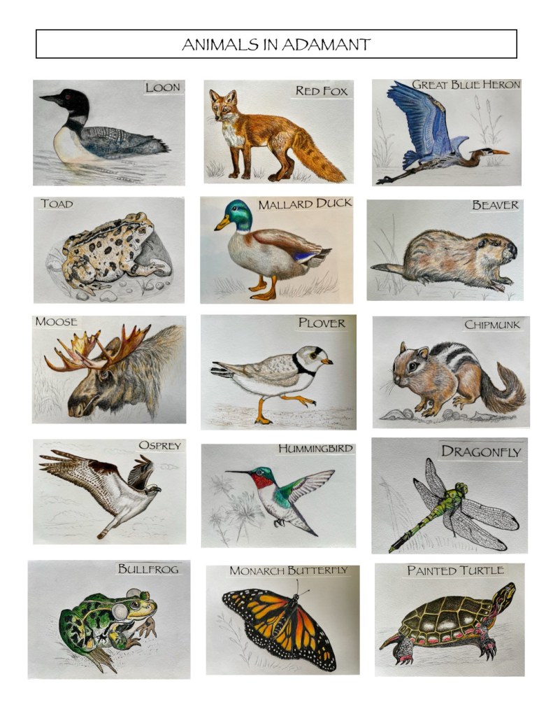 And here is a collection of my own colored pencil drawings of wildlife here in Adamant and environs:
