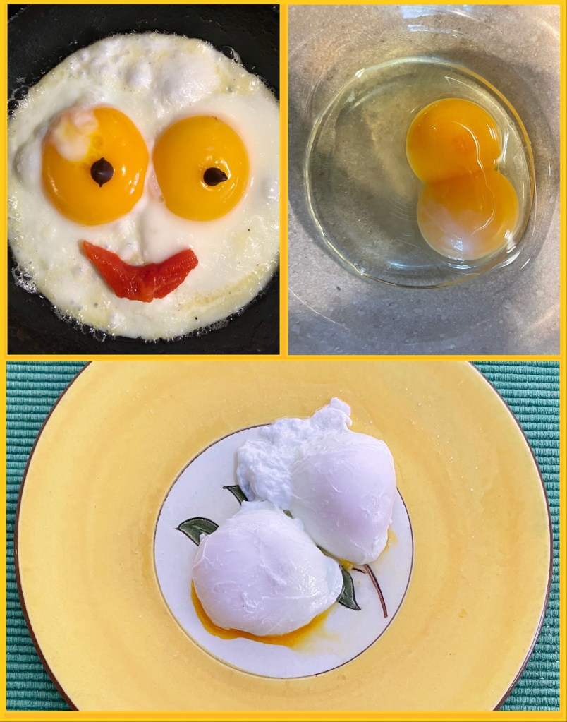 Or poached is good too, with a good luck double yolk…I especially like the double yolks because I’m a twin too.