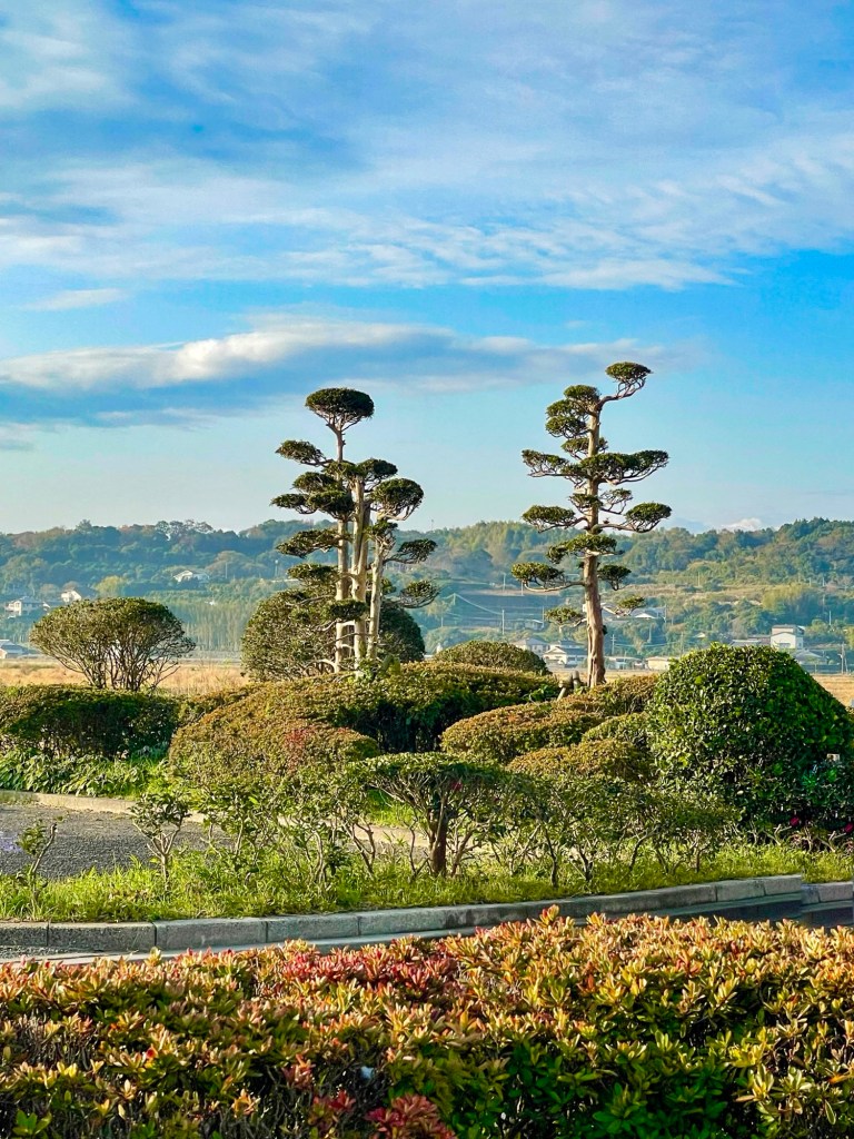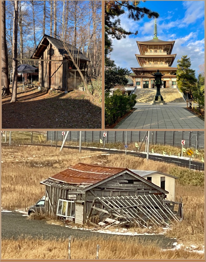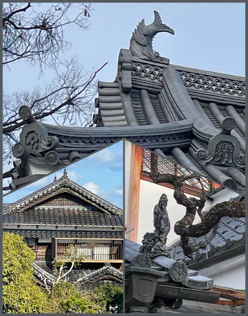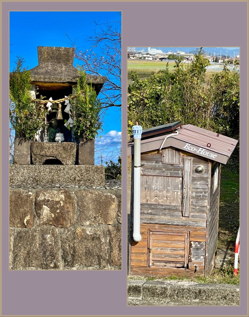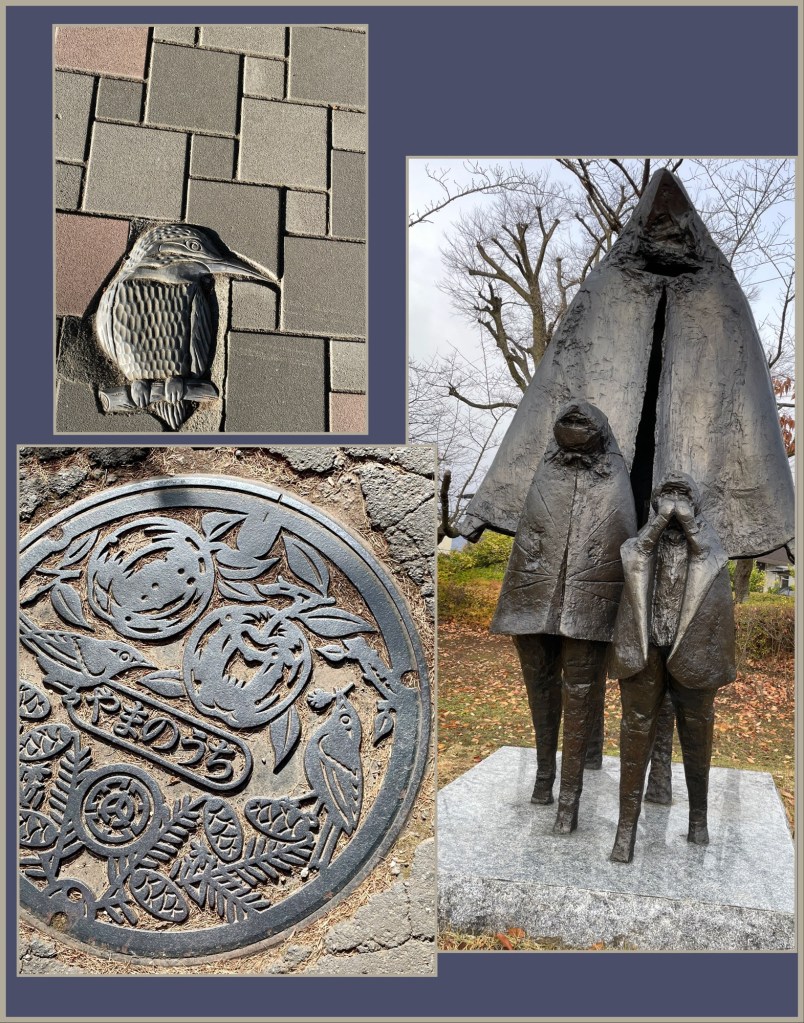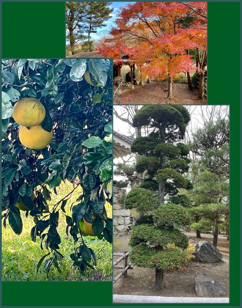 I like the roof decorations- the little gnome, the fish which symbolizes resilience, perseverance and courage in Japanese culture (especially the Koi fish), and the decorative rooftop of someone’s home in the hills .Three contrasting dwellings – top left , a place to camp overnight on a hilltop; top right a temple – home for the gods; and on the bottom a shack, maybe a chicken coop or a place just to keep the truck?The sculpture is called “Northern Mother and her Child”. No idea why. The child is covering their face with their hands. Bottom left a beautiful manhole cover with birds and plants and fruits. And top left is a metal bird relief in a sidewalk at one of the airports.Love the calligraphy etched in the stones. Mostly memorials but also just markers of various sorts.A Japanese maple decked out in orange, the topiary is probably a cypress tree, and do you know what that fruit is? It’s a pomelo.