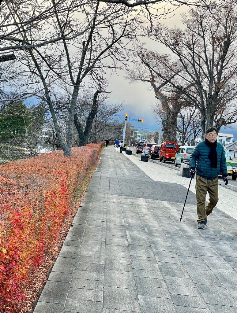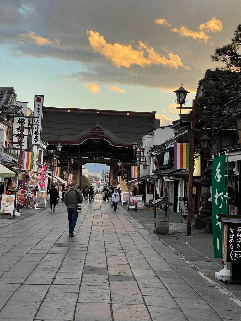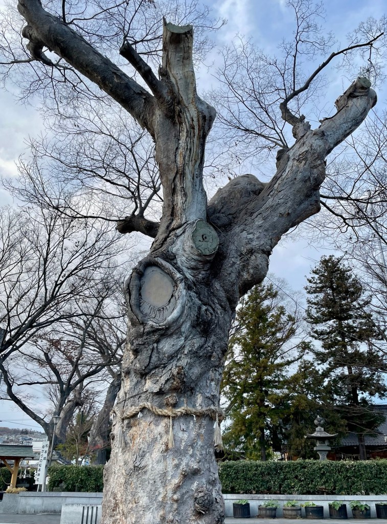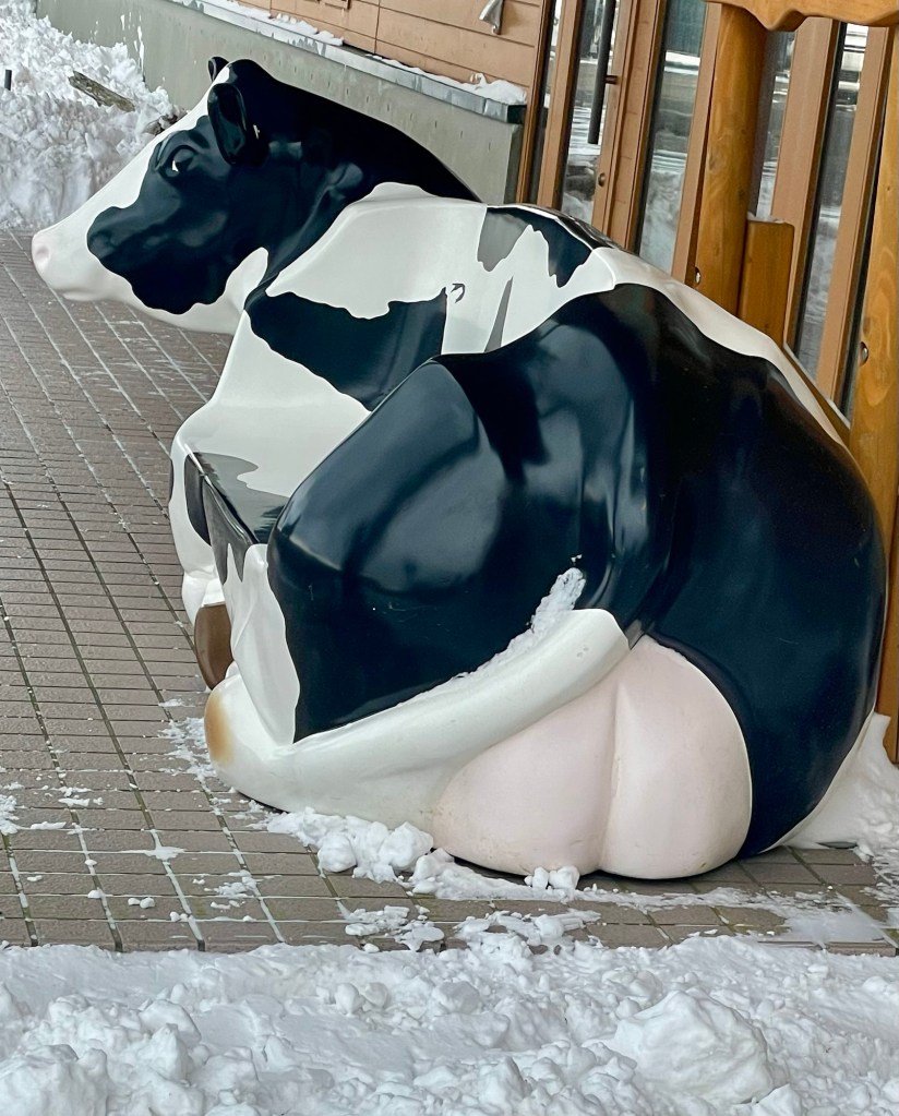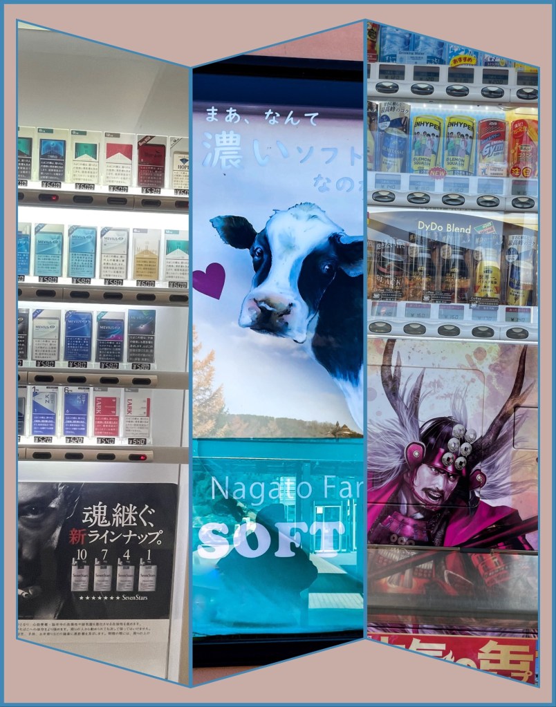 Two shrines? Well, actually one is an eco-outhouse and the other is a shrine, but for what or for whom I do not know.Walking down the street in Nagano in the late afternoon. At last a chance to window shop.On that same street – a Christmas tree in front of a wedding gown shop (yes they do celebrate Christmas in Japan!). The green frog is a sign for a real estate agency. The red sign is an advertisement for a vehicle that turns from a can into a truck??? An odd sense of humor. And the little statue with a red apron is a shrine for the children’s god – Jizo.The Viking is in a drink vending machine where they sell hot and cold drinks. Don’t know quite what he’s doing there. The panel on the left is a cigarette vending machine even though the Japanese are trying hard to have people kick the habit. Maybe that’s why the guy in the machine looks so creepy. The middle panel is a creemee advertisement. And the Japanese do love their cows even though they don’t eat much dairy at all.Cow statue in front of a store.