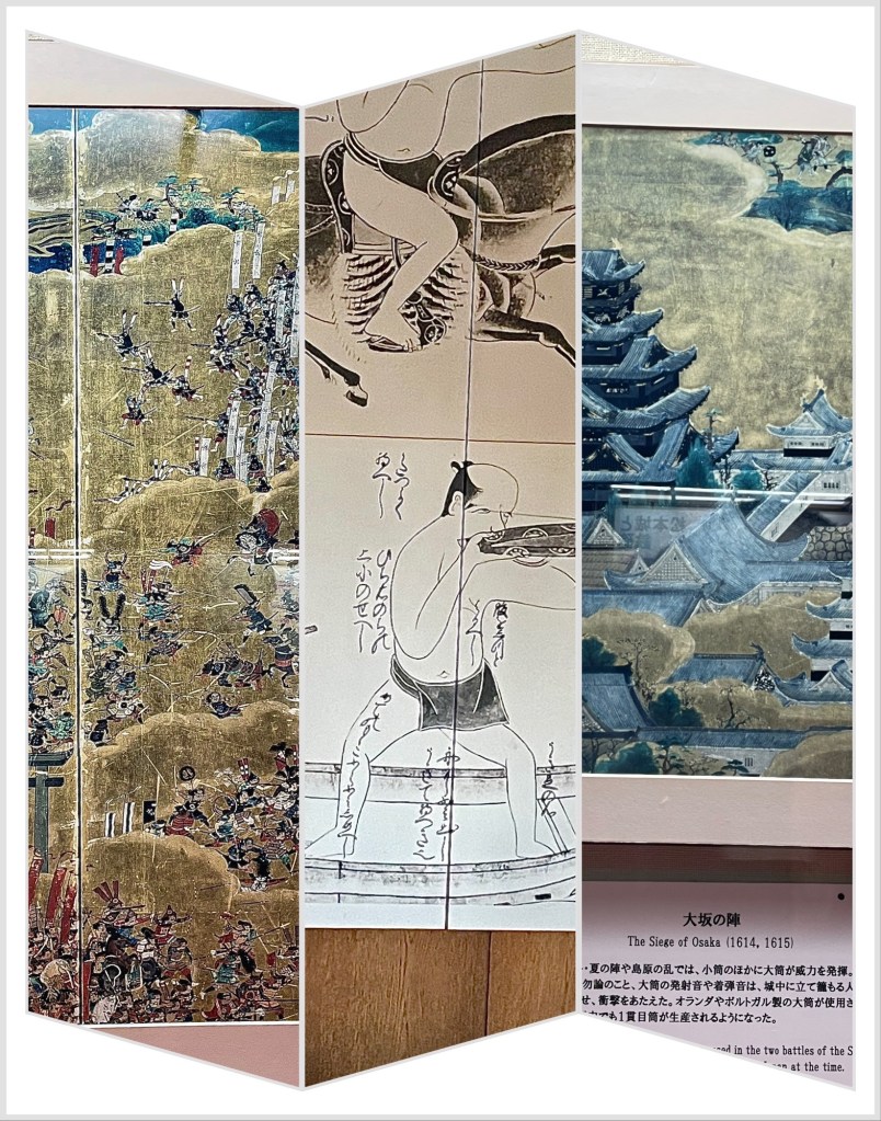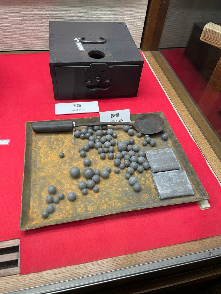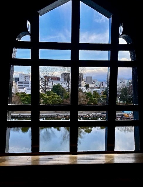 Here are some prints of warriors and battles hung up in the castle which was designed as a museum of sorts..View from a castle window. Juxtaposition of modern and ancient.At first glance I thought this was some kind of Japanese board game, but no, it is ammunition and the box it was stored in.Now we are strolling out on the street by the castleWhat a gnarly old tree festooned with rope and tassels. A survivor of many lopped limbs Reflections of treees in the moat.Time for supper.