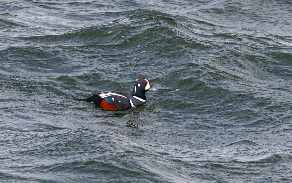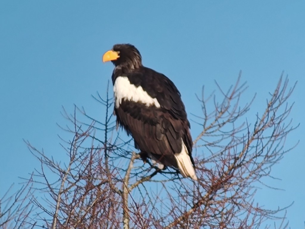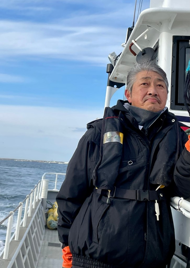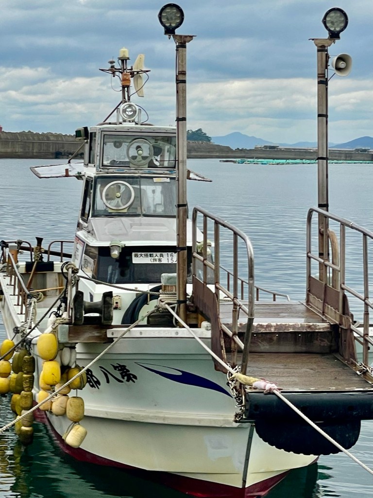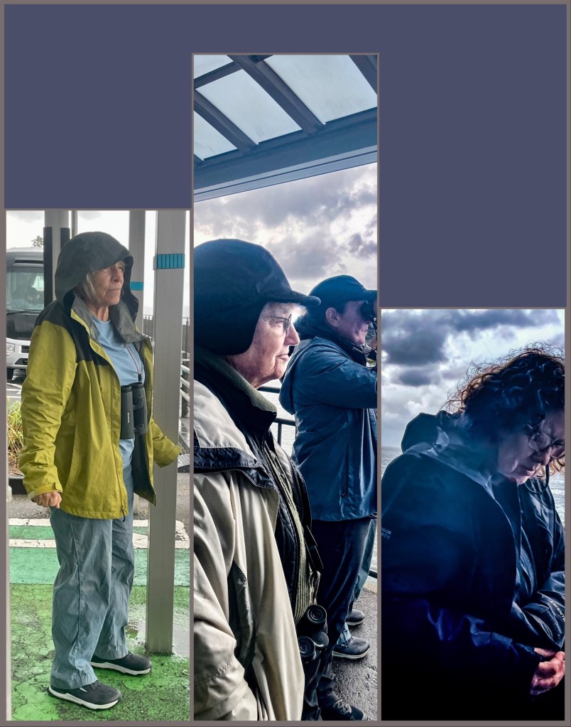 Heading out there in our van. Looks like it’s going to be a chilly day.These animals seem very familiar. Taken from our van window.An encounter. This wonderful photo was taken by one of the other birders, not me, but I couldn’t resist including it.On our way we stopped at an oceanic museum describing many of the creatures found in the sea in Japan.Awww. No, they’re not alive. The miracle of taxidermy.Definitely a wet and windy day for our intrepid birders.Out on the wharf These are the fishing boats. Which one will we be going out on I wonder?This one! Hang on tight it’s going to be a rocky ride.Our fearless captain The lookout