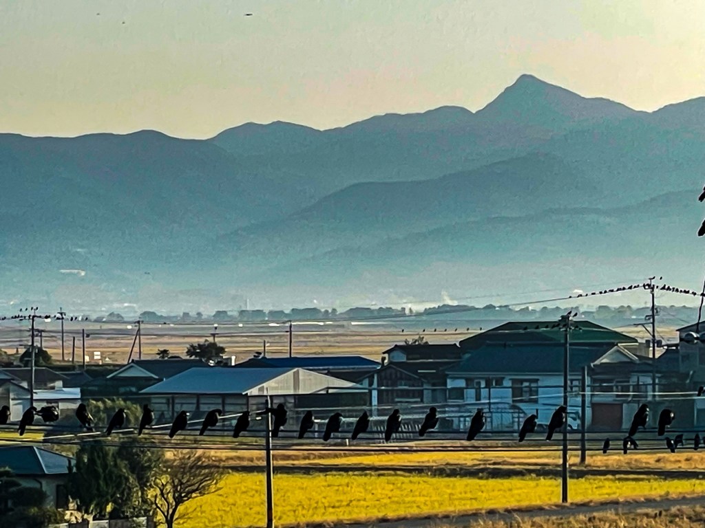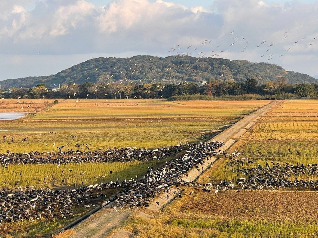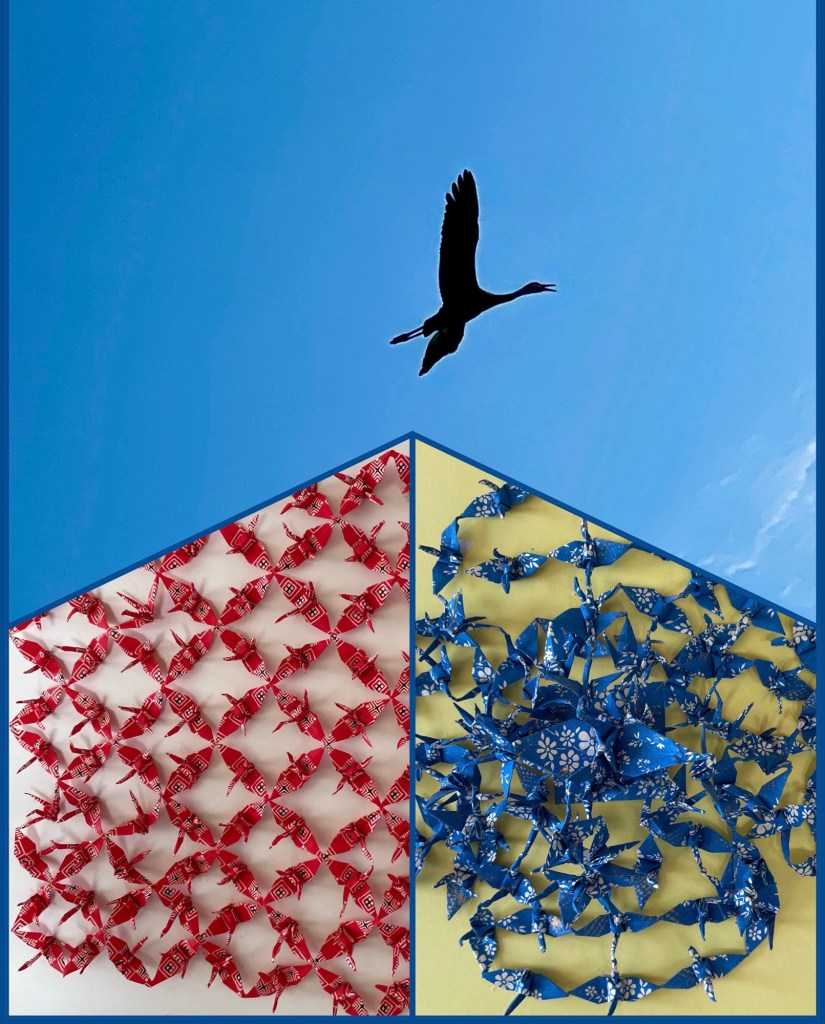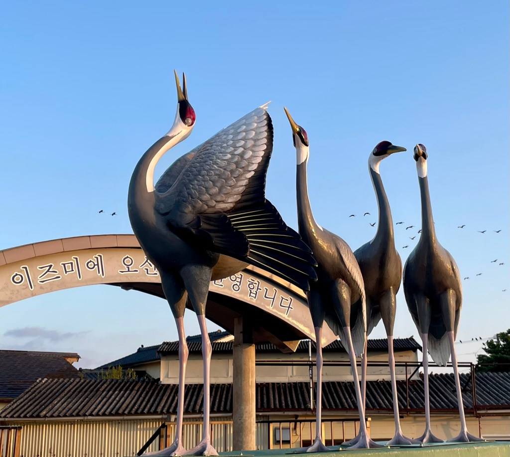Photo of a photo in the airport advertising the cranes in JapanCrane statues in front of the crane museum and observatory.Welcome to the crane museum.Origami cranes, the blue ones and the red ones each made out of one piece of paper. How on earth did they do that? They were just in large squares but I made a photo collage out of them, like a quilt.I could see thousands of cranes looking out from the observatory By the rice paddies Outside the observatory Crows on a wire outside the observatory looking towards the mountains.Flying in a pairSign for the museumLandscaping outside the crane observatory. I love the topiary trees and shrubs.Cranes on the ground at another observation point. Again not my photographs, taken by one of the birders on the trip.Time for supper but that one’s not for me thank you very much.