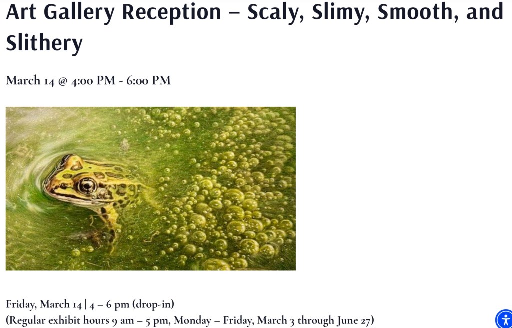 The North Branch Nature Center is having an Amphibian art exhibit. There will be an opening tomorrow (March 14). It will be fun to see amphibian art in all different media even if you’re not into frogs the way I am.