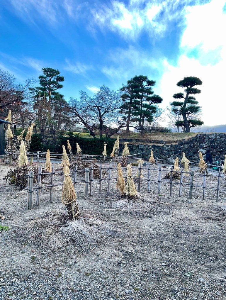 Outside the castle the shrubs are being protected from the snow by straw like we protect our shrubs with canvas or wood in winter. They look rather ghostly.Reminds me somehow of the Ku Klux Klan