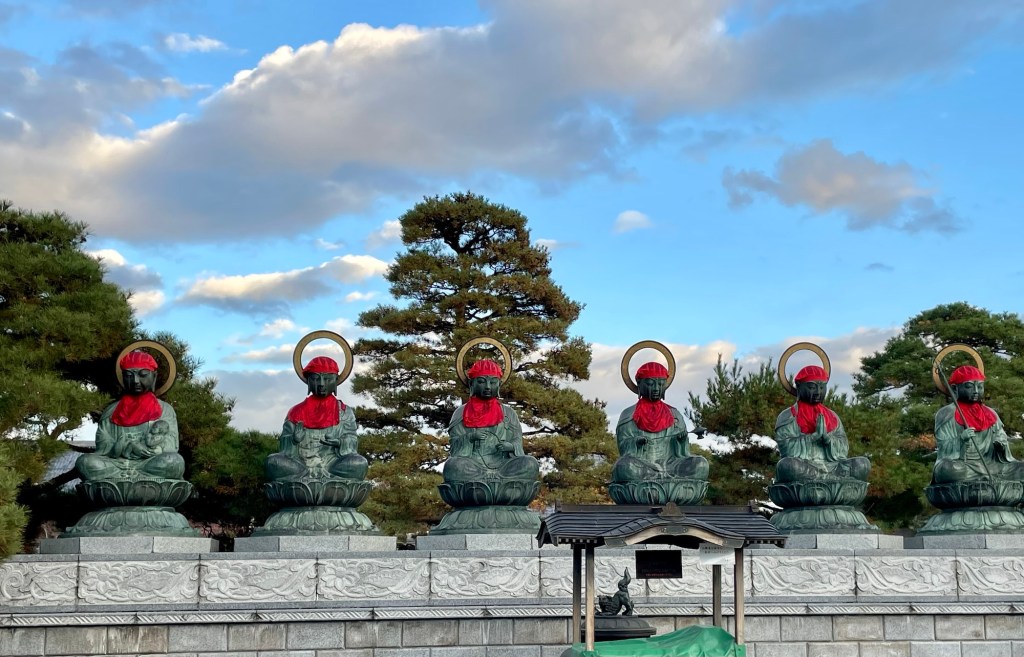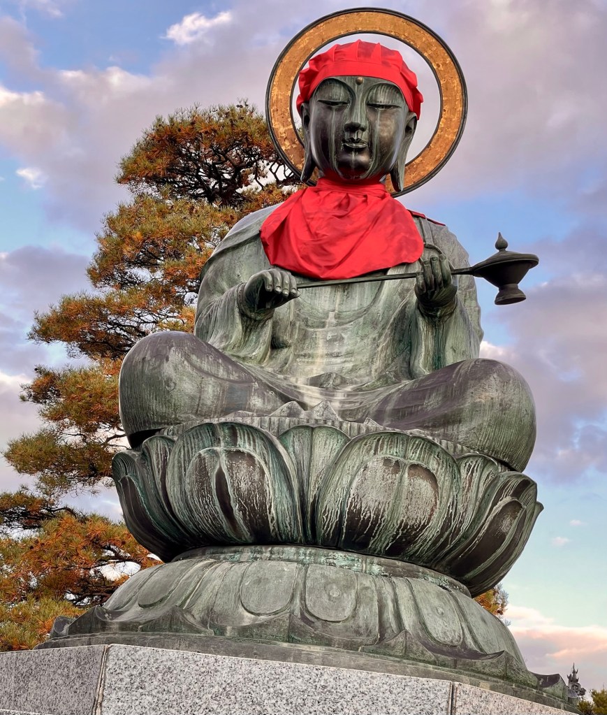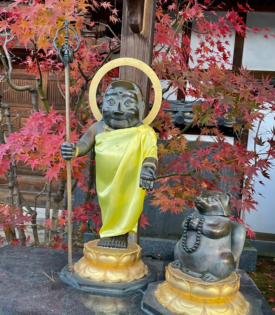 Probably a Jizo statue, protector of children and travelers, and maybe lost souls or the souls of children who have died. Yellow is a symbol of enlightenment.